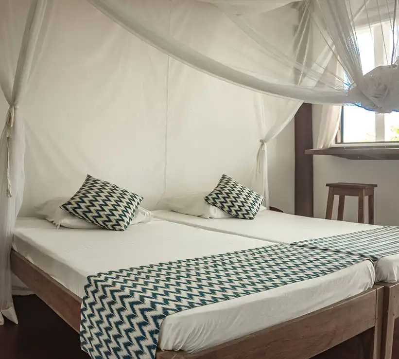 Idéale pour les petites familles ou les groupes d’amis explorant la beauté de Nosy Be, notre Chambre Twin est votre refuge parfait à l’Hôtel Chez Senga. Située directement sur la Plage de Madirokely, elle est configurée pour accueillir confortablement jusqu’à deux personnes grâce à deux lits simples.